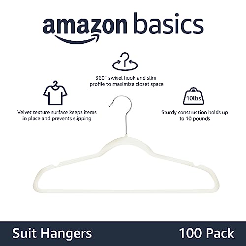 Specification: Amazon Basics Slim, Velvet, Non-Slip, Space-Saving Suit Clothes Hangers, Pack of 100, Ivory/Beige
