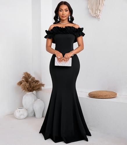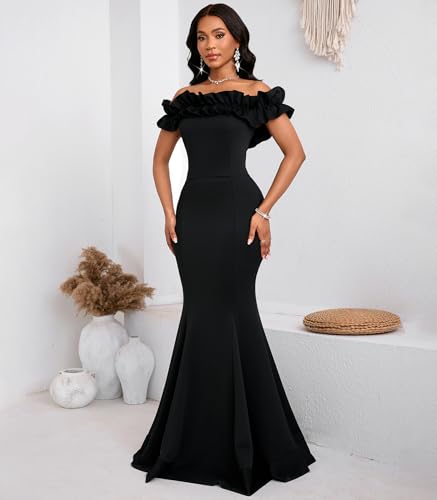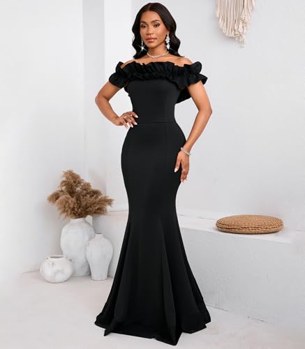 Cololura Sexy Floor-Length Off Shoulder Ruffles Stringy Selvedge Mermaid Bodycon Party Evening Maxi Dress