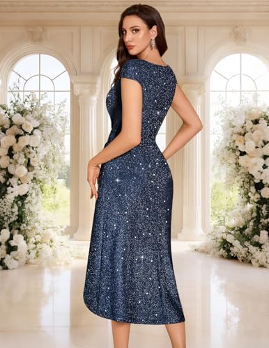 A versatile style with shimmering details to make a statement, the sparkly wrap formal dresses will be a must-have in your 2026 spring summer closet! The glitter crew-neckline and cap-sleeve design accentuates your neck and arms, and the high-waisted ruched design highlights your curves. The slit hemline drapes beautifully, make you stand out from the crowd, while the careful tailoring emphasizes your sophisticated taste and elegance. The graceful front split hemline dress shows off your legs and cascades with every step, adding to the glamour and movement! The stretchy glitter fabric makes it suitable for any body shape and easy to wear. Pairing the fit and flare sequin wedding guest dresses outfit with different accessories and high heels to shine and show your charm on any occasion. We provide a variety of colors in fit-and-flare dresses, enabling you to effortlessly transition between formal and casual events. For a touch of dazzling luxury, opt for our champagne and royalblue sparkly dresses, perfect as wedding guest attire or for evening galas where you want to exude elegance. If you’re aiming for a mature and steady look, our black and navy blue sequin dresses are ideal choices for black-tie weddings, classy school dances, or formal church gatherings. For a romantic vibe, the grape anniversary dinner dresses are a dreamy pick. The rose valentine’s celebration dresses deliver a delicate and sweet aesthetic. For those seeking a dignified and gorgeous appearance, our red and green glitter dresses will make you stand out at a vintage party, prom, or birthday. Whether you’re attending a cocktail party, going on a romantic date night, embarking on a cruise, joining a easter celebration, or hitting the disco club, our ruched slit long dresses will ensure you become the center of attention and garner compliments from everyone around you.