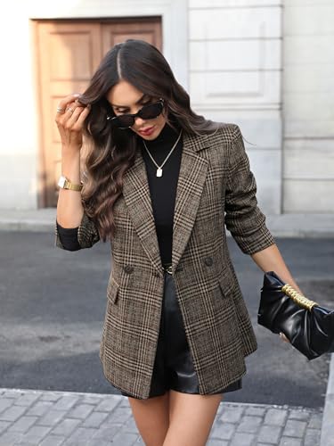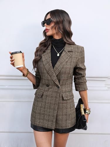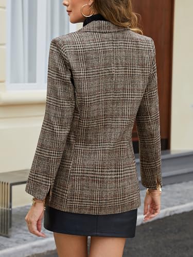 ELLEVEN Women’s Houndstooth Plaid Tweed Blazer, Casual Trendy Double-Breasted Suit Jacket with Pockets Fully Lined
