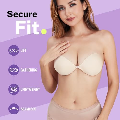 Invisible Strapless Sticky Bra Push up for Women, Ultra Adhesive Bra for Backless Dress, Cleavage Bra Lift with Pasties Kit (B Cup, Light Beige)