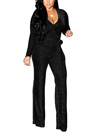LightlyKiss Women Casual Sexy V Neck Sparkly Jumpsuits Long Sleeve Onesie Loose Pants Party Clubwear with Belt