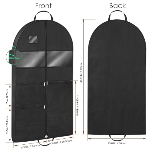 Specification: Mber 43″ Gusseted Heavy Duty Garment Bags for Travel with Accessories Zipper Pocket Shoe Storage, Hanging Clothes Travel Bag for Dresses, Suit, Coats, Tuxedo, Gowns Travel Essential, Black, 1 pack