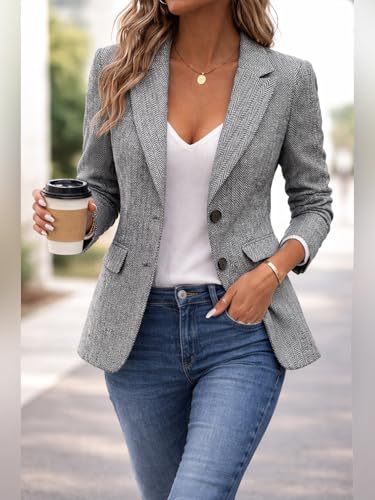 Mina Self Women’s 2026 Spring Herringbone Tweed Blazer Jacket – Notched Lapel Fully Lined Work Office Coat with Pockets