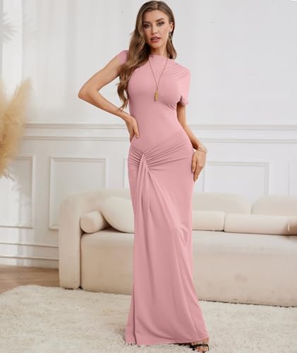 Mojessy Women Bodycon Maxi Dress Sexy Mock Neck Lace Up Bandage Ruched Short Sleeve Long Dress Cocktail Dress