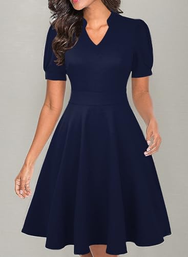 Mokayee Womens Summer Short Puff Sleeve Casual Semi-Formal Fit and Flare Church Wedding Guest Work Dresses with Pockets