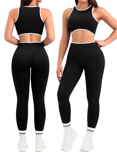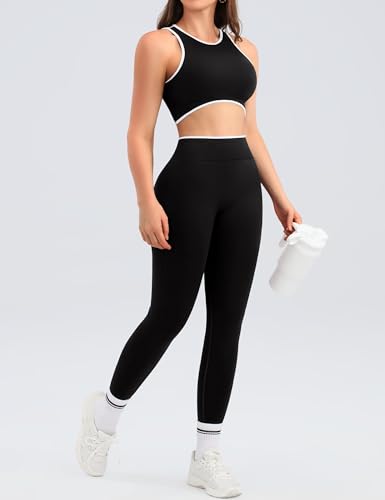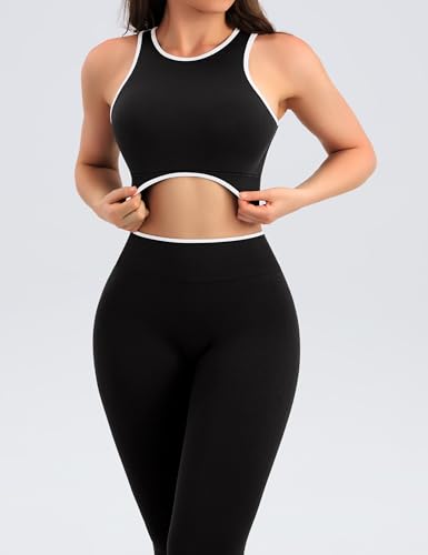 Relety Womens Workout Sets 2 Piece Seamless Crop Tank Top High Waist Leggings Contrast Trim Padded Racerback Bra Yoga Outfits