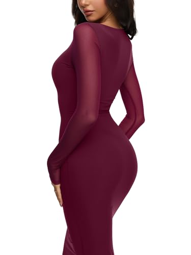 REORIA Women’s Spring Mesh Sheer Long Sleeve Wedding Guest Dress Sexy Floral Bodycon Maxi Long Dresses