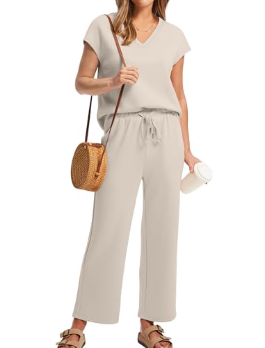 Specification: Saloogoe Two Piece Sets for Women Summer Outfits Lounge Sets V Neck Tops Wide Leg Pants Woman Vacation Travel Outfits