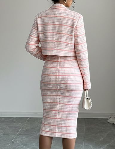 Women Plaid 2 Piece Outfits Cropped Blazer and Sleeveless Midi Dress Sets Business Casual Suits